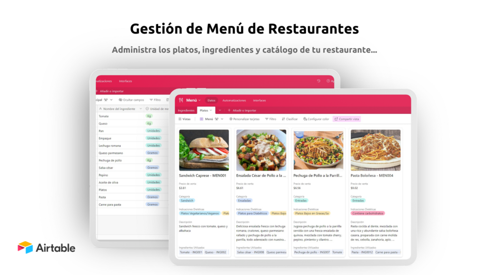 ¡Optimiza la gestión de tu restaurante con nuestra plantilla de menú de restaurantes en Airtable! Diseñada para restaurantes de todos los tamaños, esta plantilla te permite organizar y presentar tu menú de manera profesional, proporcionando a tus clientes información detallada sobre tus deliciosos platos.